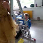 Uiteraard heb ik de hulptroepen heerlijk het behang laten verwijderen met een werkelijk schitterend, scherp geslepen stanleymes. Nadat we een aantal keren vingers moesten gaan zoeken tussen het behangafval, heb ik in al mijn wijsheid besloten het mes maar zelf ter hand te nemen.