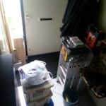 Uiteraard heb ik de hulptroepen heerlijk het behang laten verwijderen met een werkelijk schitterend, scherp geslepen stanleymes. Nadat we een aantal keren vingers moesten gaan zoeken tussen het behangafval, heb ik in al mijn wijsheid besloten het mes maar zelf ter hand te nemen.